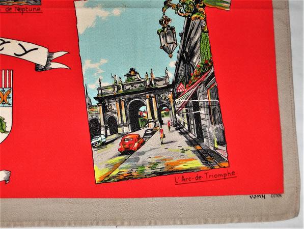 Vintage Vony Tea Towel of Nancy Lorraine France featuring Historical Landmarks and buildings. This can be used as a tea towel, wall hanging or table cover. Measures approx. 18-1/2 inches by 27 inches and is made of cotton. In very good condition except for a few light spots that may wash out.