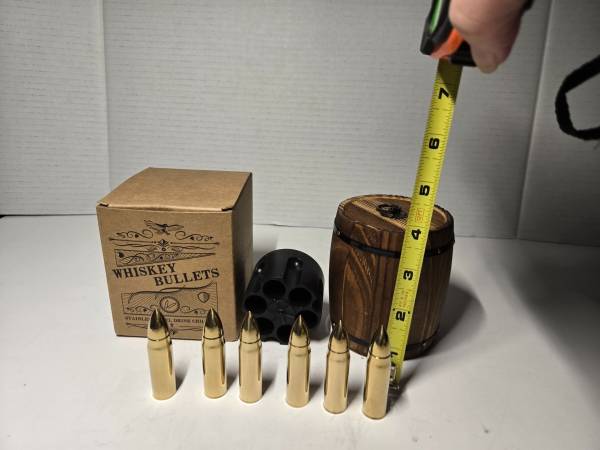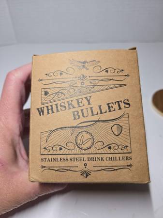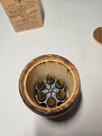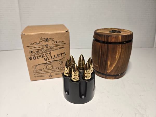 New Whiskey Bullets Stainless Steel Drink Chillers with wood Whiskey barrel and plastic revolver bullet holder. See video: copy and paste to browser......