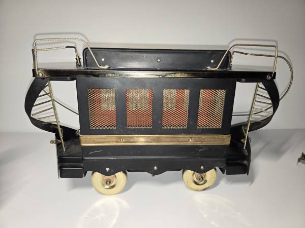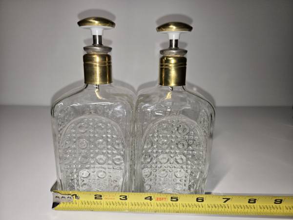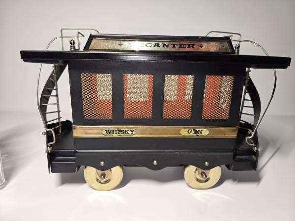 This is a vintage musical trolly liquor decanters holder. Each decanter holds about a pint of liquor. The Decanters are made of glass and the trolly is made of metal and plastic. Music box plays, "How Dry I Am". A very unique piece and makes a great gift.