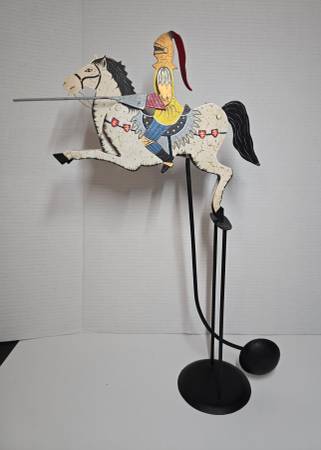 These were called ‘skyhooks’ in Victorian times. Most do nothing except rock, while this one, the knight's jousting lance moves back and forth. Item is in excellent preowned condition.