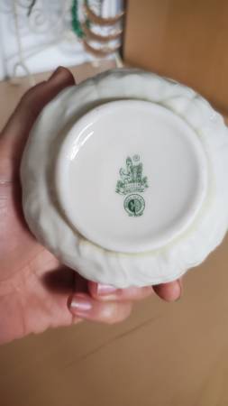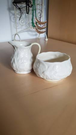 Belleek Ireland Porcelain Creamer and Sugar Bowl set. Ivory colored. No flaws or chips. Bowl measures 2 1/2" tall by 3" diameter. Creamer measures 3" tall with a 2 1/2" diameter.
