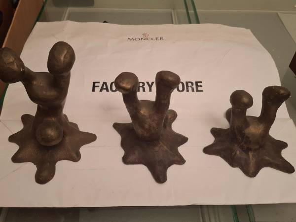 These three sculptures are abstract bronze pieces designed in a sequence or progression that suggests movement until impact, giving the impression of each colliding with the ground to a greater extent than the last.