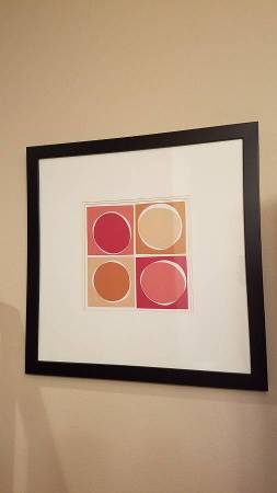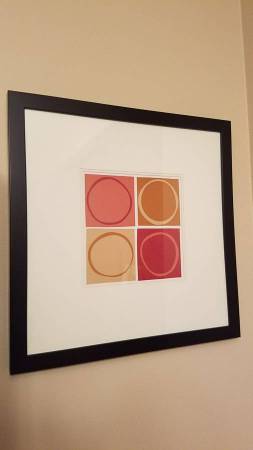 We have a pair of framed pieces of art. They are lithographs of shapes that are deep red and deep orange in color. See photos for details. Both are professionally framed. The frames are square...