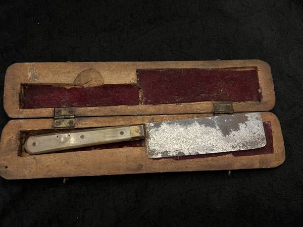 ANTIQUE 19TH CENTURY JEWISH KOSHER SHECHITA SLAUGHTER KNIFE, MARKED EZKAWSKI? THIS IS A INTERESTING ITEM . THE GRIPS LOOK TO BE HORN / FROM THE CONSTRUCTION OF THE BOX, IT LOOKS TO BE 19TH CENTURY...