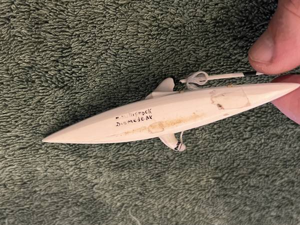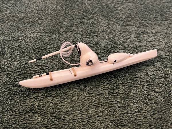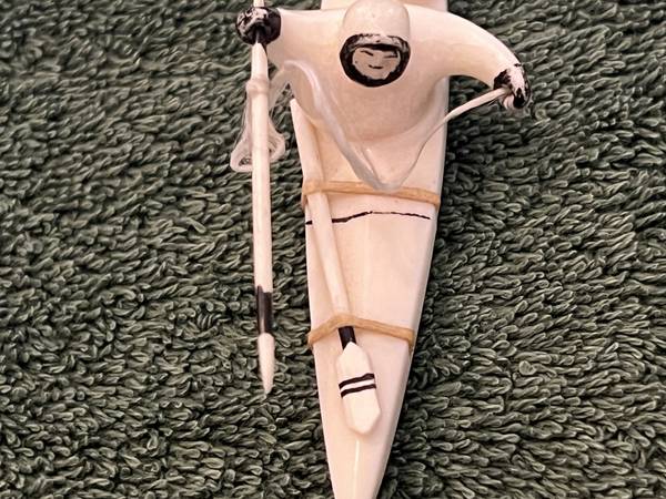 VINTAGE ALASKA CARVED BONE ESKIMO FISHERMAN IN KAYAK, SIGNED