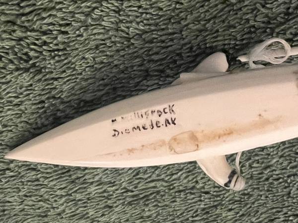 SIGNED Hunter M. Milligrock / DIOMEDE ISLAND / Eskimo Ivory Carving Kayak Hunter M. Milligrok This hunter is well equipped for his journey, with a spear in hand, a paddle and a seal floating awaiting their turn in the process of seal hunting. Scrimshaw features. 3rd to 4th quarter 20th century; signed M. Milligrok on bottom.