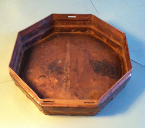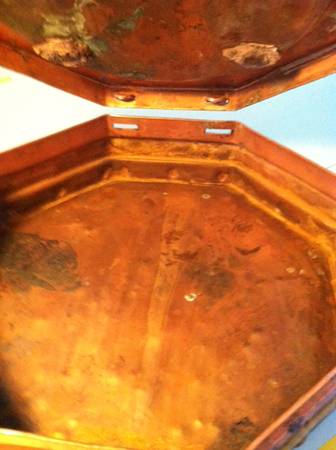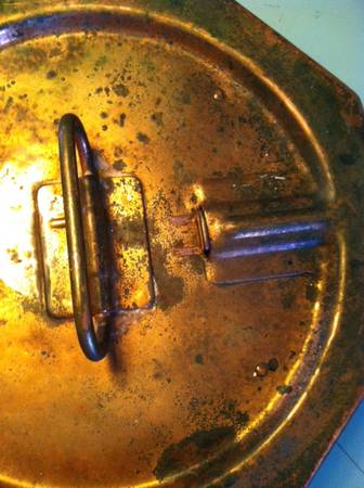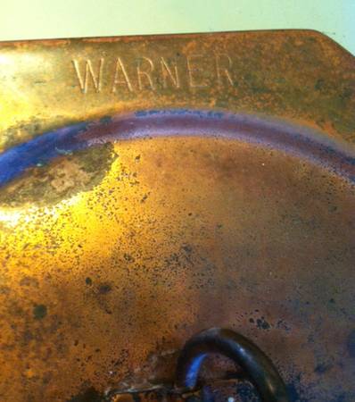 Vintage Warner film canister, probably used for newsreels. WARNER stamped on lid, opposite side features code numbers. Steel with copper plating, amazing patina. Spring loaded sliding clasp on lid interfaces with canister slot, opposite side features hinge w/similar arrangement. Well used, historical.