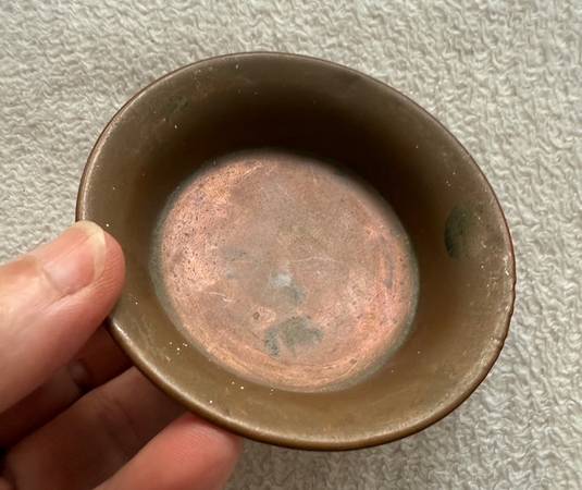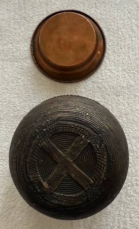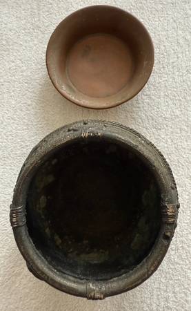 This bowl would have been used to measure grain. There is a small copper dish that sits on top of it and it is assumed to be a scoop. It fits perfectly. The history of measurement systems in India dates back to the 5th millennium BC and started from the Indus valley civilization. The Dhokra art was also started simultaneously by the artists with the bright shining brass metal. This measuring bowl is a collectible article, which depicts the rich heritage of Indus valley.