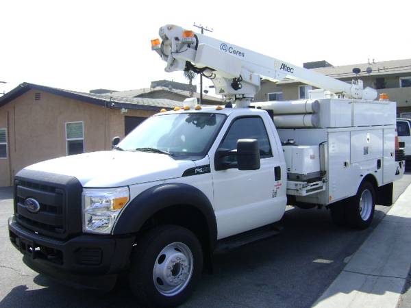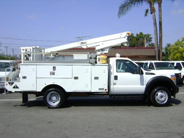 2012 Ford F450 Altec Bucket Boom Utility Service Truck Fleet Owned & Maintained, Manlift, Generator, 11' Service Bed, Side Compartments & Shelves, 16,500 LBS GVWR, Dually, 30.6 Feet Platform Height, Altec Lift, Vinyl Seats & Vinyl Flooring for Easy Clean-Up, Tilt Wheel, Air Conditioning, Dual Rear Wheels, Great for Electrician, Landscape, Sign Company and more! ONLY 101,000 MILES! Pintle Hitch, V10 6.8L Gas Engine and much more. Give us a call at 951 735-6269 or toll free at 1-877-826-7253