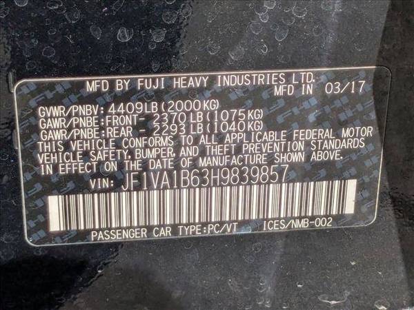 * Sti Short Throw Shifter (Wrx) * Auto-Dimming Mirror W/Compass & Homelink * Cargo Tray * Rear Spoiler * Carbon Black; Checkered Cloth Upholstery * Crystal Black Silica * Standard ModelThis vehicle includes a Money-Back Guarantee* and passed our precise inspection process. Best of all the price you see is the price you pay. No haggling. No back and forth. No pressure. And this price is so good it is guaranteed. *Money-Back Guarantee is valid for 5 days or 250 miles, whichever comes first. Subject to certain terms and conditions. See store for details. Some restrictions apply.