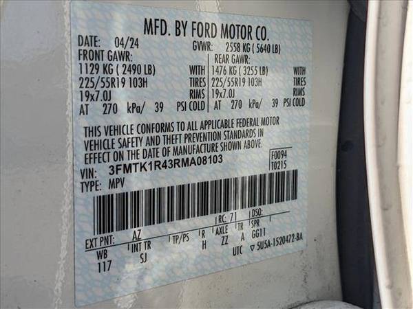 * Star White Metallic Tri-Coat * Wheels: 19" Hi-Gloss Black Painted * Mobile Power Cord (120V/240V) * Navigation System * Lane Keeping Assist * Keyless Start * Rear Spoiler * Black Onyx; Activex Bucket Seats * Engine: Primary Emotor (Rear) (Rwd) * Equipment Group 100A * Front License Plate Bracket * Transmission: Single SpeedLooking for a clean, well-cared for 2024 Ford Mustang Mach-E? This is it. This Ford includes: EQUIPMENT GROUP 100A FRONT LICENSE PLATE BRACKET WHEELS: 19 HI-GLOSS BLACK PAINTED Aluminum Wheels MOBILE POWER CORD (120V/240V) STAR WHITE METALLIC TRI-COAT BLACK ONYX, ACTIVEX BUCKET SEATS Power Driver Seat Driver Adjustable Lumbar Premium Synthetic Seats Bucket Seats ENGINE: PRIMARY EMOTOR (REAR) (RWD) Electric Fuel System Electric Motor TRANSMISSION: SINGLE SPEED (STD) 1-Speed A/T A/T *Note - For third party subscriptions or services, please contact the dealer for more information.* Treat yourself to an SUV that surrounds you with all the comfort and conveniences of a luxury sedan. This is about the time when you're saying it is too good to be true, and let us be the one's to tell you, it is absolutely true. There are many vehicles on the market but if you are looking for a vehicle that will perform as good as it looks then this Ford Mustang Mach-E Select is the one!