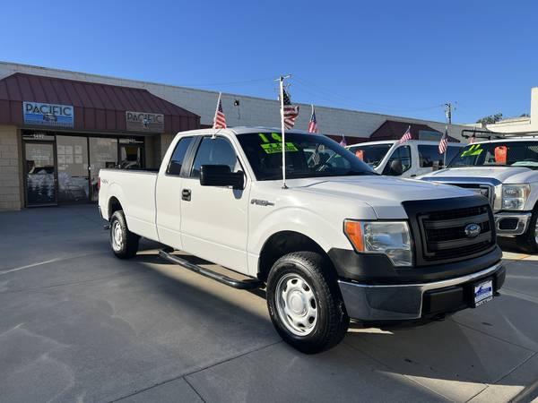 2014 Ford F-150 Super Cab 4x4 with 8' Long Bed. 5.0L Coyote V8, 6 speed automatic with manual shift, XL package with all Power Locks,Power Mirrors, Tilt wheel, Cruise Control, AM/FM/CD/Sync, Bluetooth, Remote key less entry, Nerf bars, tow package, Bed liner. 1 owner Fleet maintained truck. This truck looks like new! Call or come by to drive it.