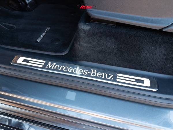 The car is finished in Selenite Metallic Grey and features LED headlights, AMG exterior styling, sunroof, grey painted brake calipers with the Mercedes Benz Logo and chrome bumper.
