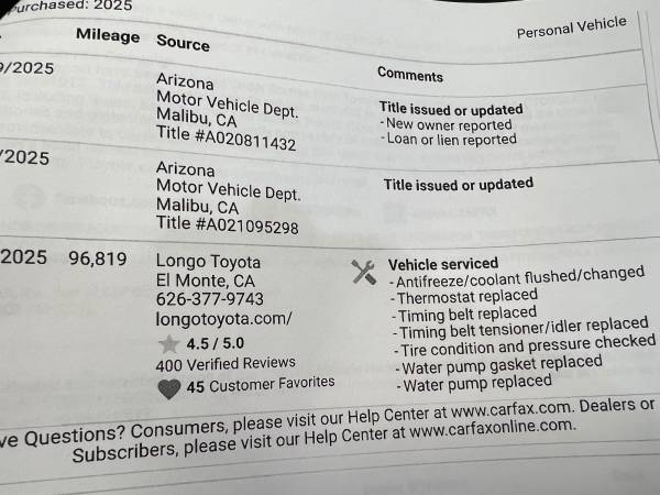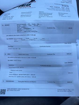 Since I bought it I took Longo Toyota and had a subsequent inspection, they only recommend new timing belt and water pump, thermostat, which I had them install.
