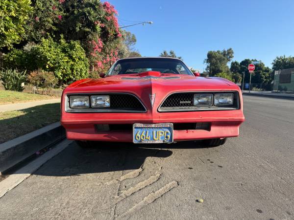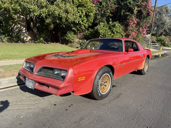Here is a lovely example of a 1978 Pontiac Firebird Trans Am. Affectionately know as Big Red. This is a pretty unusual car as it just pulled it out from a garage 3 blocks from my house after being parked up in a garage for over 20 years. It was a one owner vehicle from new and I have all the records from day one I've got a folder of over 3 inches of receipts and paperwork detailing all the work was done over the years. The car is very original with mostly original paint finished and red with a black interior. This car was a equipped with the desirable WS6 performance package, 403 V8, automatic transmission, 323 posi rear end, electric windows, door locks, with factory air conditioning (needs a new AC compressor as the old one is leaking). I found the original build sheet under the back seat. Its been a California car all is life and still retains the original blue and yellow license plates. The engine is original to the car and has a partial VIN stamped on the block. The panels are all original and there is only one spot of rust at the bottom of the right fender, otherwise the car is rust free. I replaced the whole braking system with new master, calipers, wheel cylinders, shoes and brake hoses. A new set of BFG Goodrich T/As were also installed and new shocks front and rear. The car runs really nicely with no issues. I have the original handbooks and warranty paperwork. Clean California title. Drive your passion. The car is located in West Los Angeles and inspections are welcome. Serious buyers only, no trades.