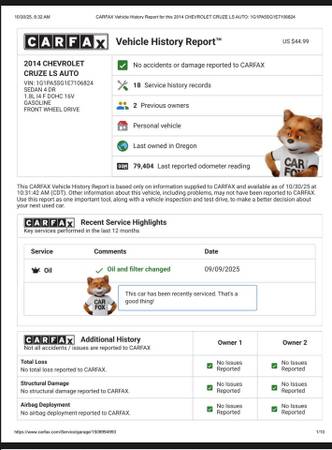 Attached is the clean carfax-will send remaining report upon request. I have clean title in hand. Registered in Oregon.
