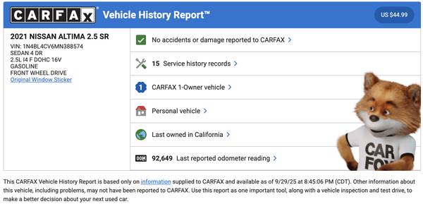 Hello, I am selling my 2021 Nissan Altima SR with 92,0000 Miles