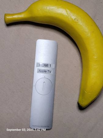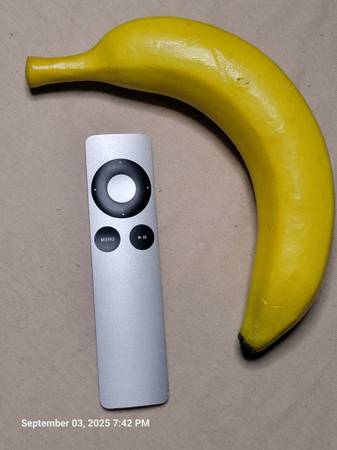 Apple A1294 aluminum remote control, compatible with Apple TV (2nd and 3rd generation), Mac computers, and select iPod docks. Slim silver design with black navigation ring and buttons. Great replacement or spare remote. Banana for scale.