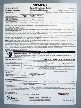 - Siemens 3-Phase, 4-Wire, 200A Fused Disconnect