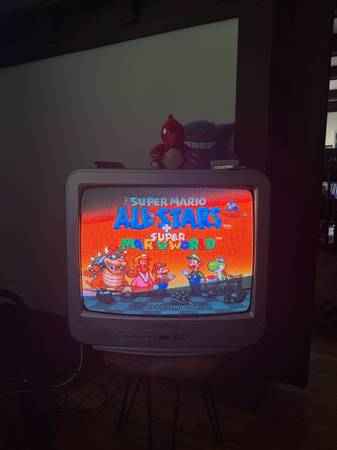 Low hour CRT with Composite and RF inputs. Geometry is perfect on this one. Has convenient handles to carry, perfect size tho, I find bigger than 19 inch to be too heavy and cumbersome to move. No remote but been using a universal. You can get to the AV and Menu without it though. Great to retro gaming or creative video art or monitoring your live stream. Has Orien tube, crips color and brightness. I’ll throw in a TruTech RF modulator so you can have more than one composite input in. Nothing wrong with it I just have too many.