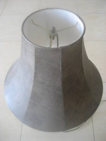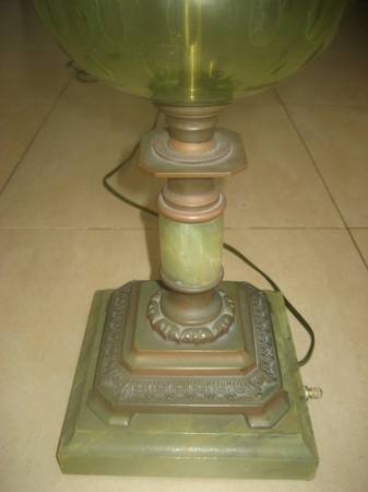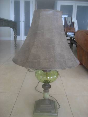 Quality classic table lamp with beautiful snake skin type shade, flared bell shade measures 7" across the top and 17" across the bottom, approx 28 1/2" high, made of wood, bronze (antique brass?), stone (marble?), green glass, uses one light bulb (fluorescent, incandescent, or LED), in excellent shape and working condition.