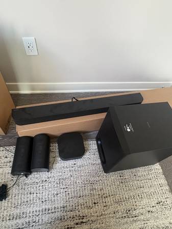 - Hear cinematic surround sound and deep bass with 3 front-firing speakers, two rear speakers, and included subwoofer.