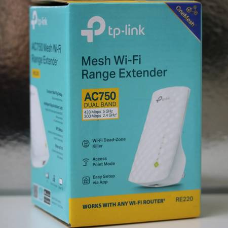 Dual-band Wi-Fi range extender with speeds up to 750Mbps. Includes original box and packaging insert. - Model: RE220 - Dual Band: 2.4GHz & 5GHz - Speed: 300Mbps (2.4GHz), 433Mbps (5GHz) -...