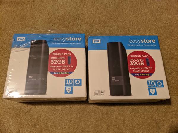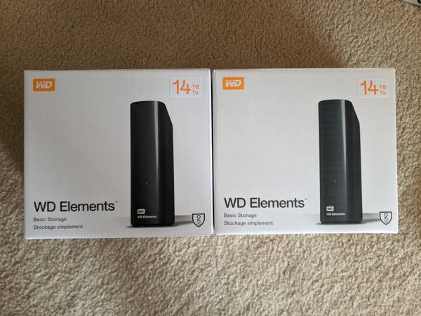 I'm selling two brand new / sealed 14TB Western Digital Elements external desktop hard drives and two used 10TB Western Digital easystore external desktop hard drives (total of 48TB of storage) for $720 cash total for all of them. The price is pretty much firm.