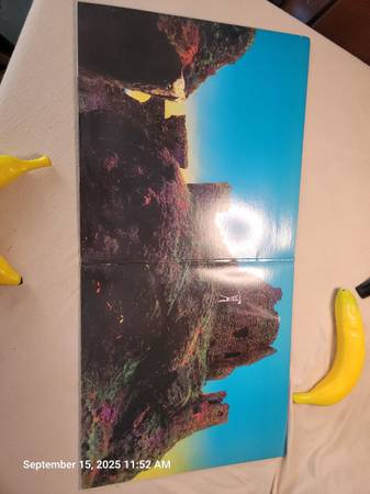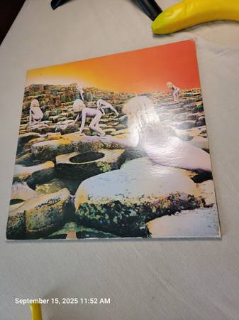 Original pressing of Led Zeppelin’s Houses of the Holy. Iconic cover art by Hipgnosis featuring the Giant’s Causeway scene. Includes tracks like “The Rain Song,” “Over the Hills and Far Away,” and “D’yer Mak’er.” Cover shows some wear, vinyl untested. Essential addition for any Zeppelin or classic rock collector. Banana for scale.