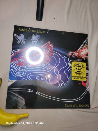 Sealed limited edition silver vinyl pressing of Death of a Bachelor by Panic! At The Disco, released as part of Fueled By Ramen’s 25th anniversary series. A collector’s must-have with striking artwork and exclusive color variant. Banana for scale.