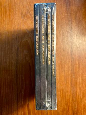actory-sealed The Godfather DVD Collection from Paramount (2001). Includes all 3 films plus a Bonus Materials disc (3+ hours of extras). Widescreen, Dolby Digital 5.1, English & French audio, English subs/CC. Classic slipcase with three individual movie cases + bonus disc.