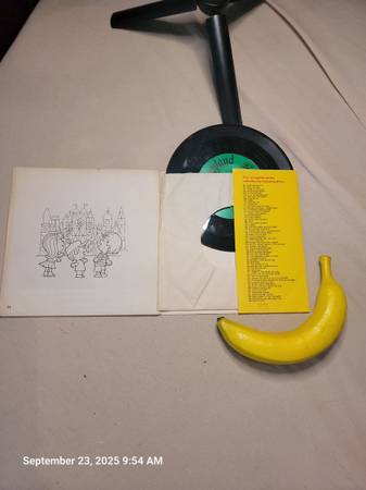 Vintage 1965 Disneyland Record and Book set: Walt Disney’s Story of Mary Poppins with songs from the film. Includes 33⅓ RPM vinyl record and 24-page illustrated read-along book. Features classic Sherman brothers songs including “Supercalifragilisticexpialidocious” and “Chim Chim Cher-ee.” Cover shows wear and has partial shrink wrap, record with visible play marks but playable. A charming Disney collectible for fans of Mary Poppins and mid-century children’s records. Banana for scale.