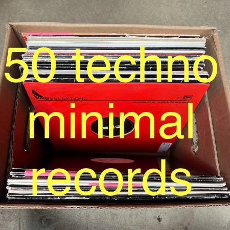 50 records MUST TAKE ALL, NO LIST AVAILABLE, no individual sales, and no cherry picking. records pictured are included, and the rest are similar. mostly techno & minimal music, with a hint of industrial, experimental, acid, leftfield, new beat ... singles and remixes, perfect for DJing. all playable - some plates are like new, some white labels, some used sleeves do show a bit of wear / are missing. all individuals, no duplicates. ready for a new home!