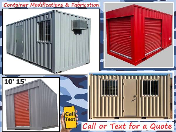 We Convert or Modify, 10ft, 20ft, 40ft Containers into: Jobsite Container Storage, Self Storage Facilities, Construction Storage, Mobile Office, Tool Storage, Equipment Storage, Inventory Storage, Work Area, Work Shops, Emergency Shelters, School Buildings, Artist Studios, Flower Stands, Firework Stands, Fire Training Facilities, Military Training Bunker, Movable Exhibition Stands, Agriculture Storage, Farm Equipment Storage, Ranch Storage, Snack Bars, Concession Stands, Boat, Classic Car, Truck, Motorcycle, Tractor, ATV, Snowmobile Storage, Automobile Storage, Guard Shacks, Hunting Shelters, Retaining Walls, Secure Perimeter Barriers, Fencing and Storage, Containers as Underground Bunkers Wine Storage and Temperature Controlled Storage for Food.