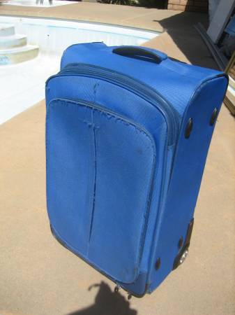 Suit cases. I have several suit cases . One is a large rolling bag, for $15. It is the pictured blue one. It is 23 1/2" X 18" X 7" (pictured). A hard sided, blue one is 24" X 18" X 7", for $12 (pictured). I also have a soft sided one (21.5" x 14" x 6"), for $10.