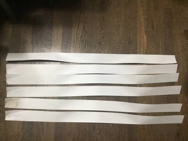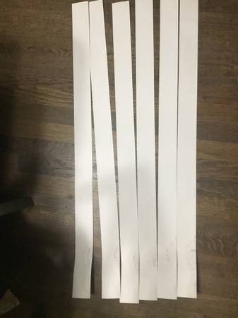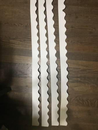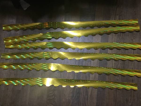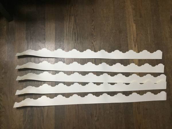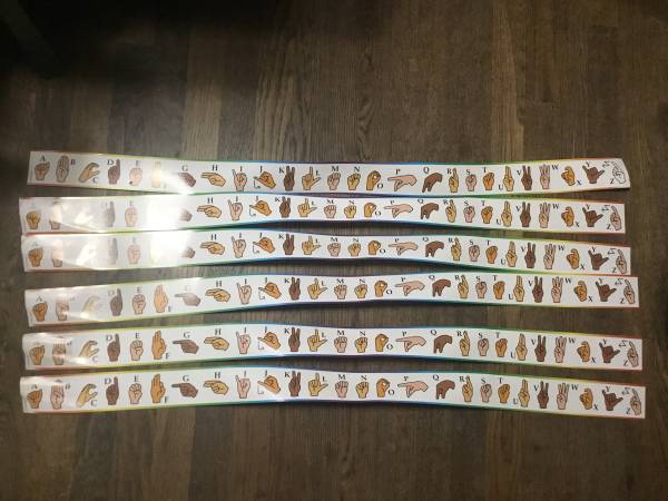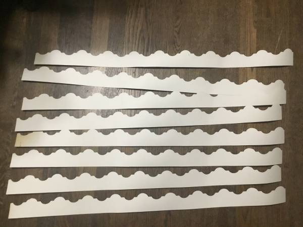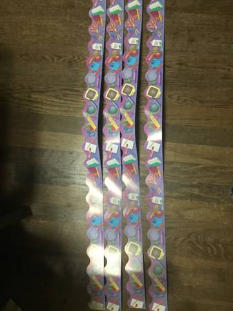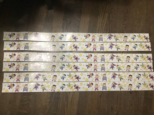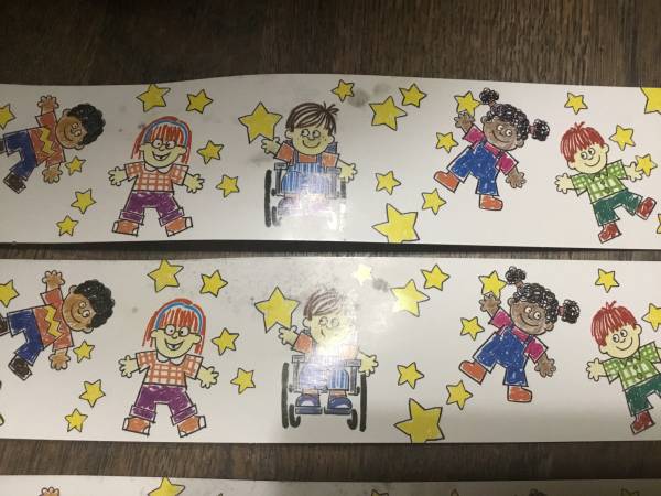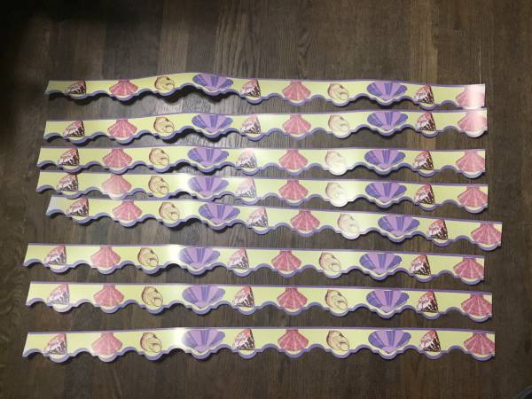 There are six different borders. The gold shimmers with scalloped edges have stains on the back of two of them and are slightly curling. The kids with stars have small stains on the front and larger stains on the back. The school supplies have damage to the scallop edge of all of them and a stain on the back. The apples with pencils have a small stain on the back. The hand sign alphabet has some stains on the front and back. Several of the scalloped edges of the shells have damage. The quantity of each is in the photos.