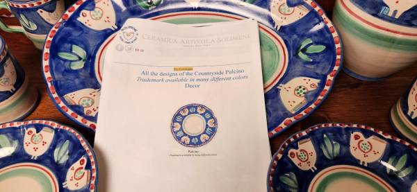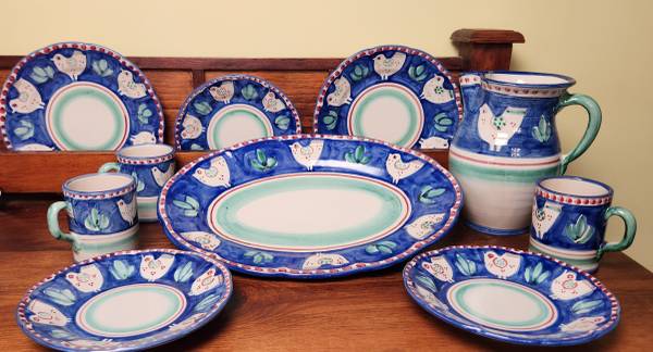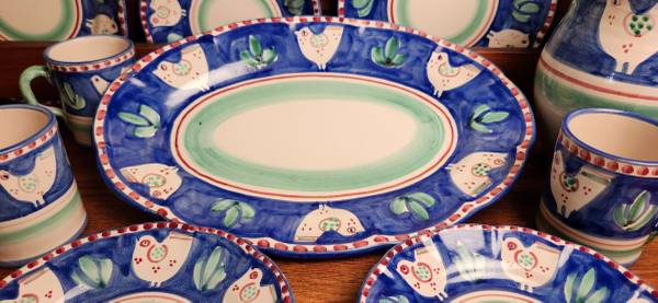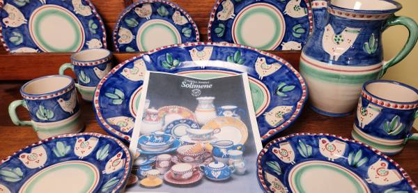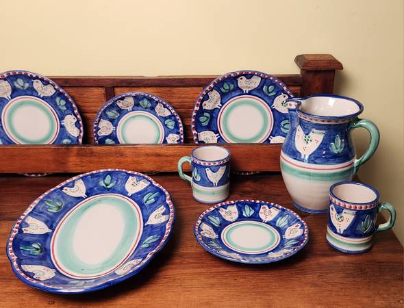 Vintage 1970's Italian Dinnerware from the Amalfi Coast of Italy. There are Beautiful Colorful Designs on this set of "Countryside Pulcino" that has been Hand Painted with Lead-Free Enamels at Ceramica Artistica Solimene where the family has worked for over a century. When Vincenzo Solimene decided in 1954 that they needed a new building for their Headquarters and Factory in Vietri Sul Mare, he asked the famous Architect, Paolo Soleri to design it for him and it became one of the "most significant architectures of the 20th Century." Solimene Artistic Ceramics is world famous and exports all over the world. Here are 31 pieces in total. (1) 16" Oval Platter, (12) 8" Plates, (12) Coffee Cups, (5) 12" Dinner Plates, and (1) 8 1/2" Water Pitcher. Three of the Dinner Plates have some chips around the edges, but everything else is in perfect condition. All for only $120 or best offer. A Great Deal. Call Ken at show contact info