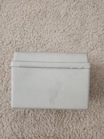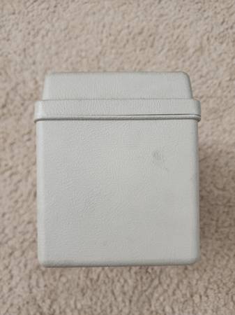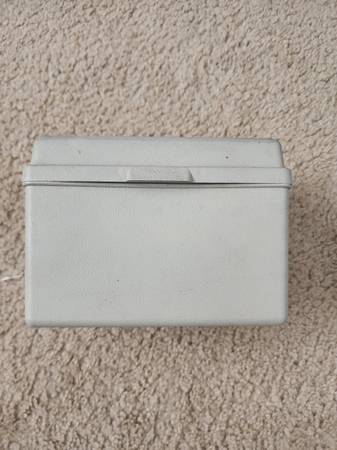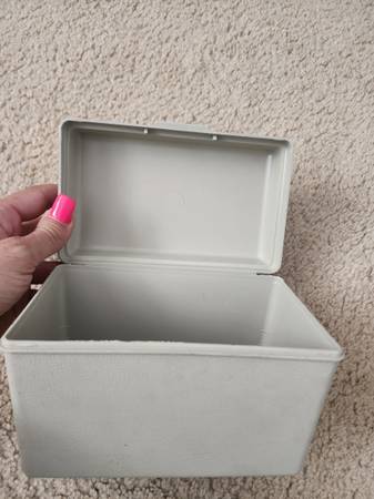 Measures 6.5 in wide x 5 in tall x 4 in depth. Can be used to store recipe cards, index cards, random things. Is made of thick plastic and seals tight to close.