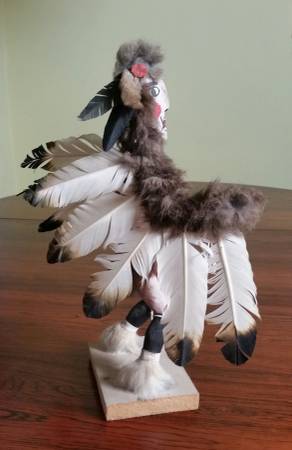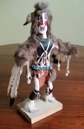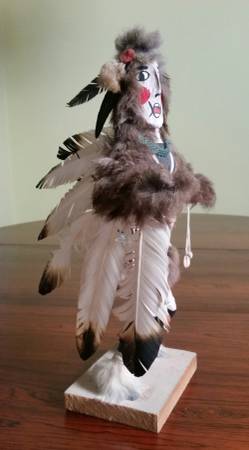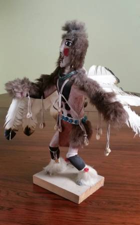 Vintage Navajo Kachina, "Eagle Dancer". The Eagle dancer Kachina represents strength & power. He is the ruler of the sky and the messenger to the heavens. Figure Size is approximately 14" high with a wing span of approximately 10 1/2". I believe this is from the 1960's. Only $65 or best offer. Western, Southwest, Cowboy, Adobe, Rancho, bungalow, turquoise. Call Ken at show contact info