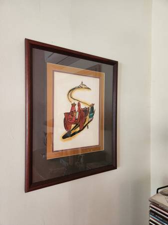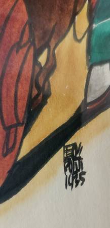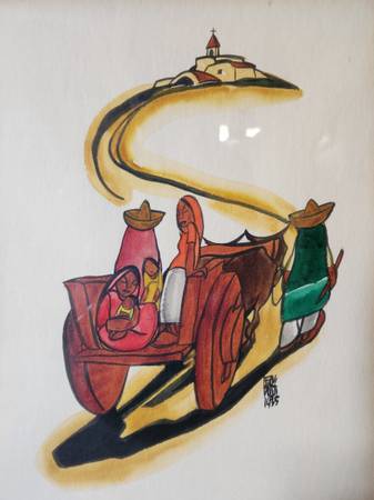 Really nice Watercolor by Leo Politi. Politi was an artist and illustrator who lived in downtown Los Angeles in the 1930's and his work has become very collectable and sought after. This is one of his famous Mexican scenes of a family on an ox cart headed up the hill to church. It's very colorful and striking. This is signed and dated1935 by the artist. Its framed nicely and is triple matted. Note: the two white spots you see on the picture is a reflection of light on the glass in the frame, not on the artwork itself. Overall size is 17 3/4" wide x 22" high. Image is approx. 9" wide x 12 1/2" high. In excellent condition. Only $475 or best offer. Call Ken at show contact info