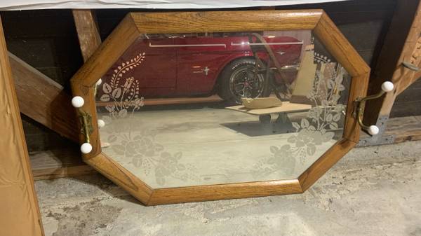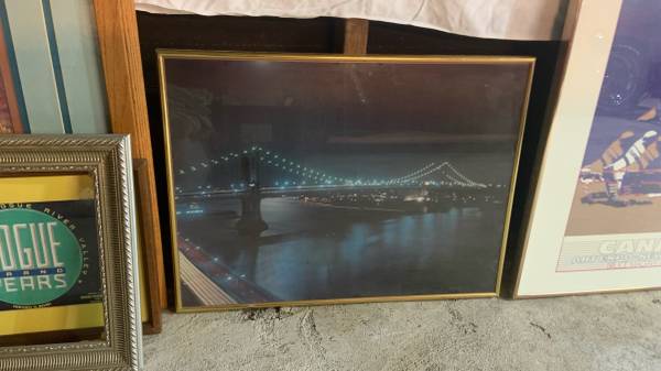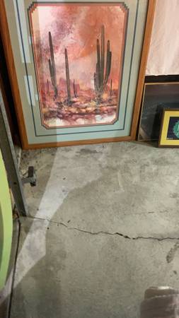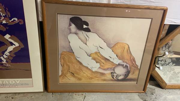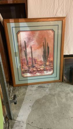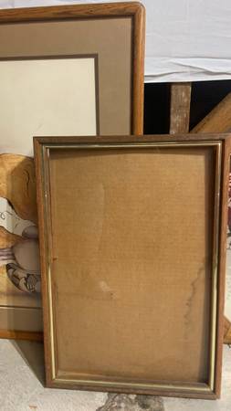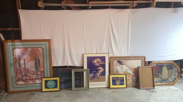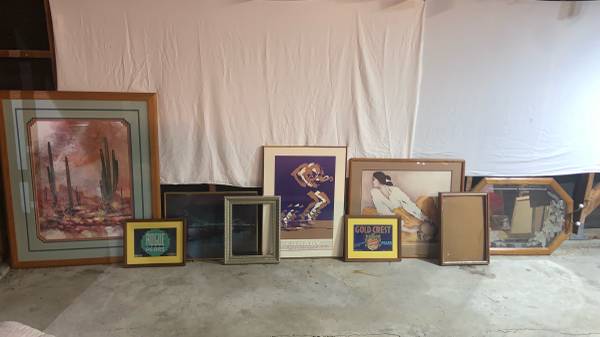 Lot of 9 framed pictures, frames and mirror. Sizes range from 11 x 14 to 35 x 43. All for $60