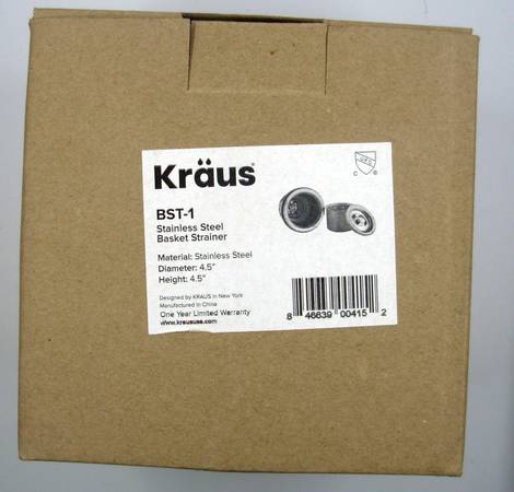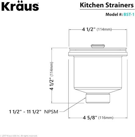 Kraus Basket strainer is an ideal addition to your kitchen sink. A high quality strainer prevents food particles and debris from obstructing the drain pipe Basket strainer is constructed from stainless steel Kraus Basket Strainer installs in sinks with standard 3.5-Inch or 4-Inch opening An open/close stopper that seals tightly makes this strainer convenient and reliable Manufactured by Kraus Limited Lifetime Manufacturer Warranty Dimensions: Outer size-4.5-InchInner size-3.15-Inch Height-4-InchDiameter pile-1.75-Inch