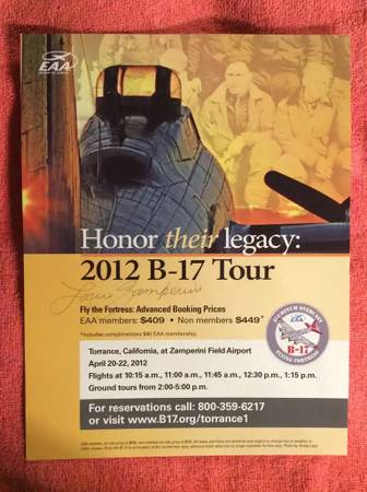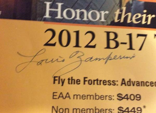 LOUIS ZAMPERINI HONOR THEIR LEGACY 2012 B-17 TOUR SIGNED MINI POSTER AUTOGRAPH WORLD WAR II HERO 8.5" X 11" ON LIGHT CARDBOARD THIS WOULD LOOK REALLY GREAT WHEN FRAMED. PLEASE LEAVE YOUR NAME AND...