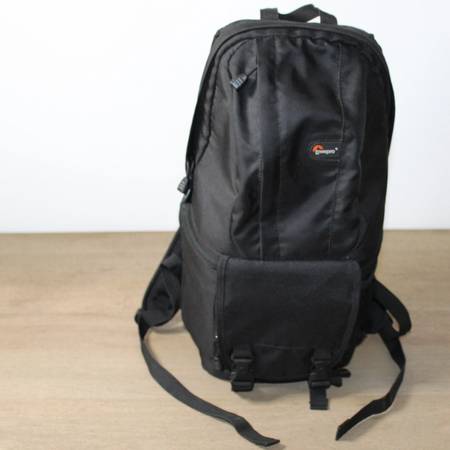 Lowepro Fastpack 100 backpack for DSLR cameras with padded compartments and side-access panel. Clean and functional with minor signs of wear.