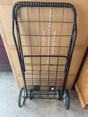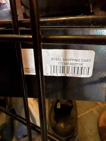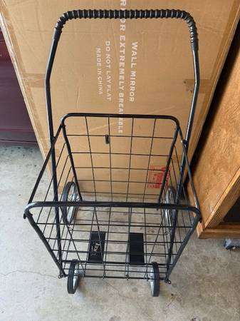 Black steel shopping cart with four wheels. Great to bring items from car into home. Great condition