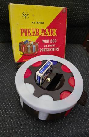 VINTAGE, POKER CHIPS IN A ROTATING RACK, IN ITS ORIGINAL BOX. COMES WITH A DECK OF CARDS.