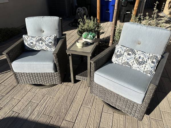 Includes Two Woven Glider Chairs, One Porcelain Tile Side Table, and Two Lumbar Pillows