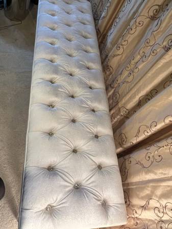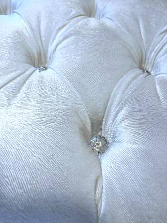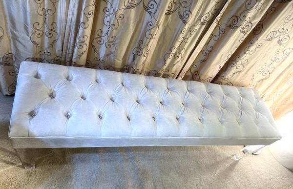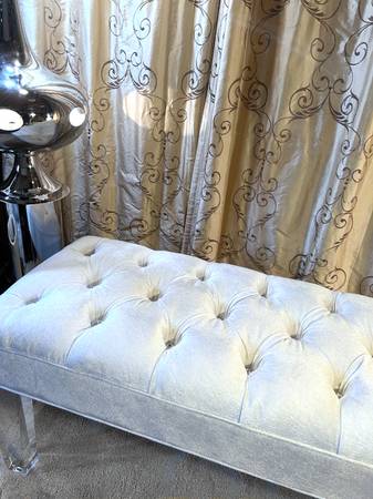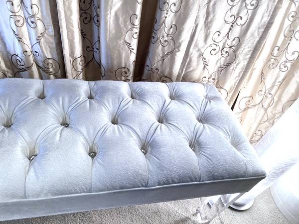 Shlomi Haziza HStudio High End Luxury White Chesterfield Bench Settee Blanket Holder Acrylic Legs White Luxurious Milano Ultrasuede super soft Stain Resistant Upholstered Fabric with a beautiful sheen and embellished Swarovski Crystal Buttons