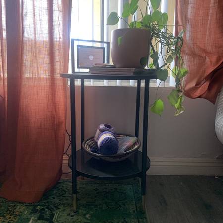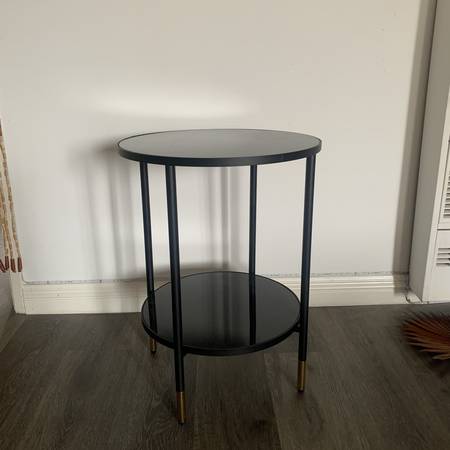 Lightly used and like new. The tabletop in tempered glass is stain resistant and easy to clean. Height: 23 5/8 " Diameter: 17 3/4 " Height under furniture: 6 3/4 " Max. load: 11 lb Max load/shelf:...