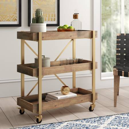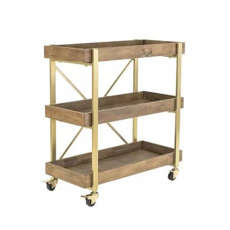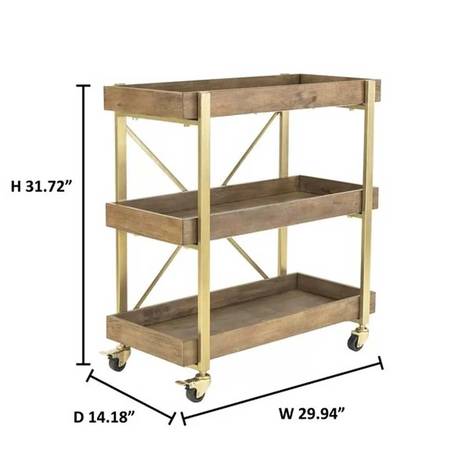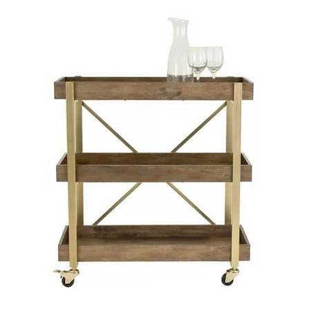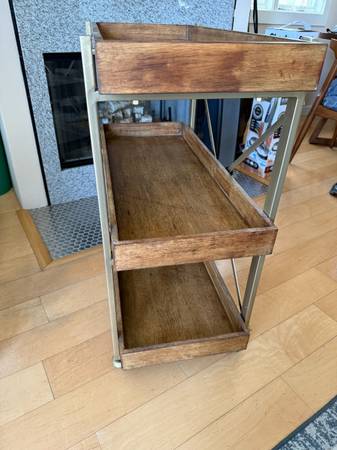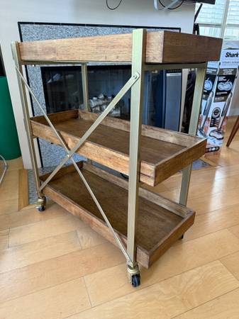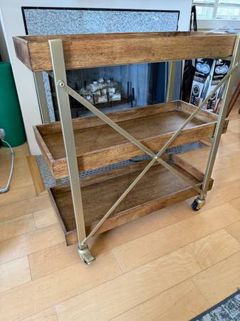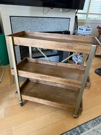 Dark wood bar cart with gold accents/fixtures. Modern style with great storage capacity. We have loved this cart for a long time but are unfortunately remodeling and no longer have use for it. Originally paid $300 for it, have kept it in excellent condition - and you don't have to assemble it!